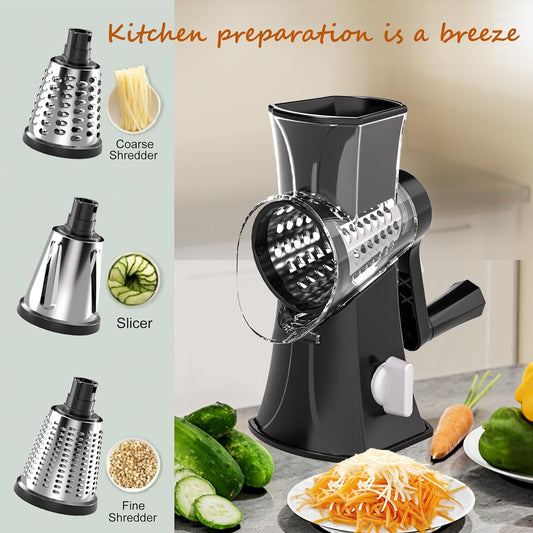 3-in-1 Rotary Cheese Grater Vegetable Slicer, 3 Interchangeable Blades Food Shredder with Anti-Slip Reinforced Suction Base, Kitchen Mandoline Chopper (Black)