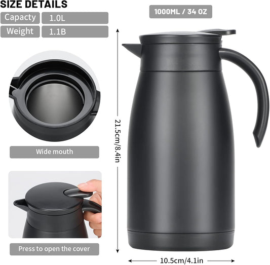 34 Oz Thermal Carafe, Insulated Stainless Steel Coffee Carafes for Keeping Hot Coffee & Tea for 12 hrs and Cold for 24 hrs, 1L/Black