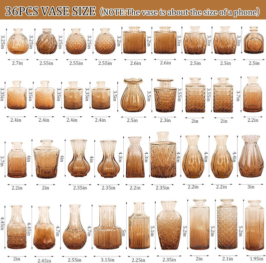 36Pcs Bud Vases Set Small Vintage Glass Bottles Bud Vases in Bulk Multiple Shape Cute Glass Vases for Rustic Wedding Centerpieces Table Decorations and Home Decor(Amber)
