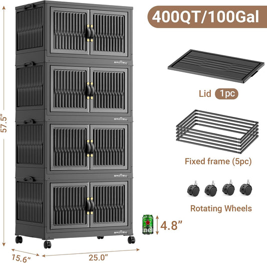 400Qt Stackable Storage Bins with Lids, 100Gal Closet Organizers and Storage Drawer, Plastic Collapsible Storage Bins with Doors, Heavy Duty Store Box Cabinet for Home Office, 4Pack Black