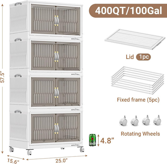 400Qt Stackable Storage Bins with Lid, Extra Large Closet Organizer Collapsible Drawer Boxes with Wheels, Folding Plastic Cabinet Containers for Home Kitchen Room Organization, 4Pack White