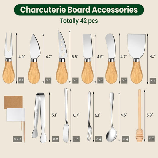 42 pcs Charcuterie Boards Accessories Cheese Knife Set with Wooden Handle, Charcuterie Utensils Gift with Butter Spreader, Forks, Spoons, Tongs, Honey Dipper and Tags for Party, Wedding