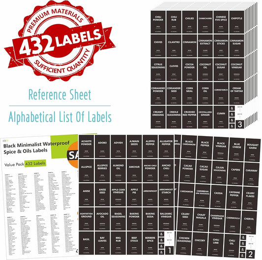 432 Removable Spice Labels, 396 Pre-Printed Herb Seed Seasoning Sauce Oil Vinegar Stickers, 36 Blank Ones, Waterproof Oil&Tear Resistant, No Residue for Kitchen Pantry Containers Jars(White on Black)