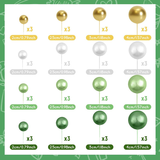 48 Pcs Balls Cake Topper Decorations Balloon Cupcake Toppers Foam Cake Topper Balls Cake Balls Decorations for Birthday Party Cake Decorating (Green, White, Gold)