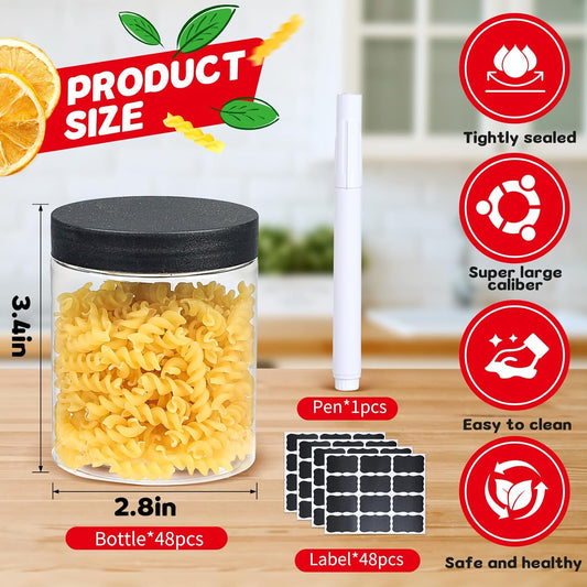 48 PCS 8 OZ Plastic Jars with Screw On Lids,Labels Refillable Empty Round Slime Containers for Storing Dry Food, Honey Jam, Cream, Butter, Lotion, black