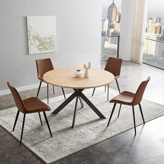 46.4" Round Dining Table Set, Mid Century Modern Round Dining Table for 4-6 Person, w/Steel Legs, Coffee Table for Kitchen Dining Room, Office, Save Space (1 Table with 4 Brown Chairs)