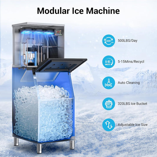 500LBS/24H Commercial Ice Machine Maker, 320LBS Capacity Large Industrial Ice Maker, Clear Ice Cubes Ready in 5-15min, Micron Water Purification Filter 99% impurities, for Cafe, Bar