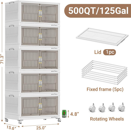 500Qt Stackable Storage Bins with Lid, Extra Large Closet Organizer Collapsible Drawer Boxes with Wheels, Folding Plastic Cabinet Containers for Home Kitchen Room Organization, 5Pack White