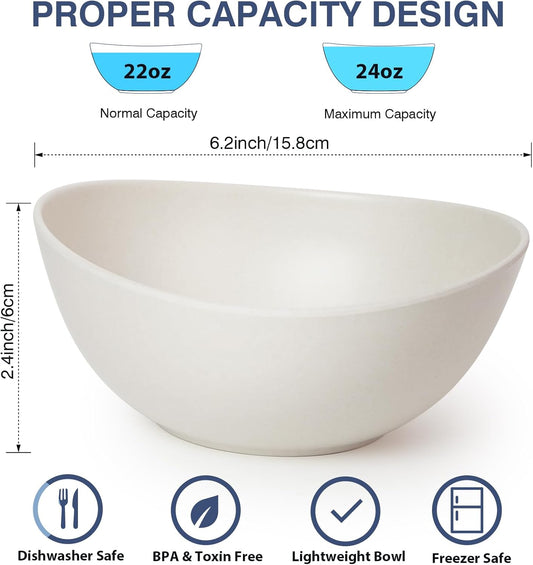 6.2'' Bamboo Fiber Cereal Bows Set of 6, Soup Bowls 24 Oz for Serving Salad, Snack, Side Dishes, Modern Oval Lightweight Bowls for Breakfast, Lunch and Dinner, Dishwasher and Freezer Safe(Matte White)