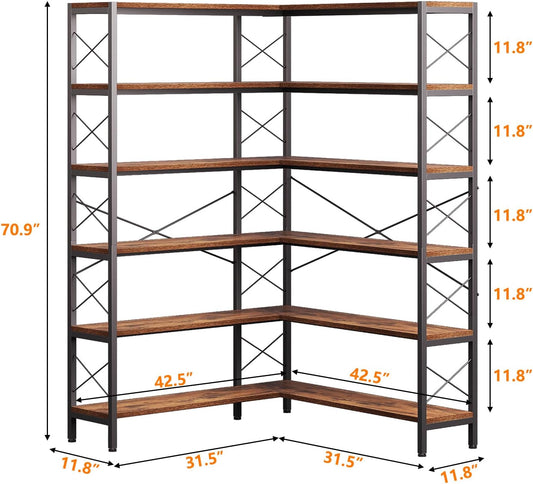 6-Shelf Corner Bookshelf, Vintage Industrial CornerBookshelf Etagere Bookcase, Large Book Shelf with Metal Frame Open Storage Corner Cabinet for Living Room Home Office(Retro Brown)