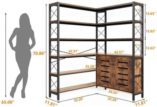 6-Shelf Corner Bookshelf, Vintage Industrial Corner Shelf Etagere Bookcase, Large Book Shelf with Metal Frame Open Storage Corner Cabinet (Brown-Lockers)
