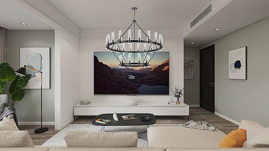 60 Inch Black Wagon Wheel Chandelier 2 Tier with Glass Shade, 30 Lights, Modern Farmhouse Style, Ideal for Dining Room, Kitchen, Entryways