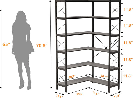 6-Shelf Corner Bookshelf, Vintage Industrial L Shaped Bookshelf Etagere Bookcase, Corner Shelf with Metal Frame Open Storage Rack Corner Book Shelf for Home Office Living Room (Retro Brown)
