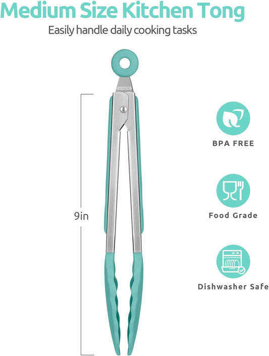 600ºF Heat Resistant Kitchen Tongs: U-Taste 9 inch Silicone Cooking Tong with Firm Sealed Non Stick Rubber Tips & Silicon Coated 18/8 Stainless Steel Handle & Smooth Locking for Serving Salad-Aqua Sky