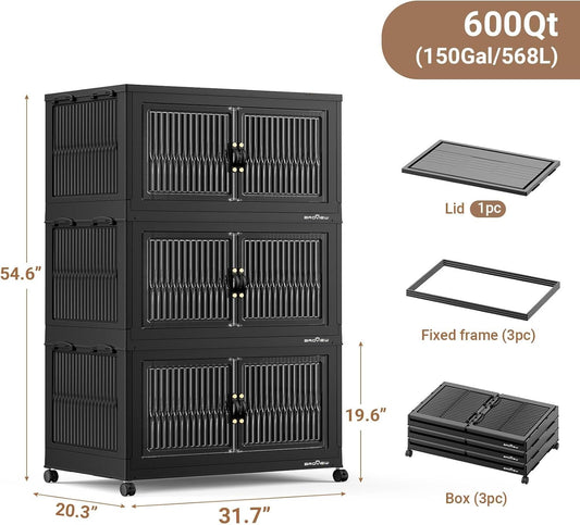 600Qt Extra Large Stackable Storage Bins with Lid, Closet Organizer Collapsible Drawer Boxes with Wheels, Folding Plastic Cabinet Containers for Home Kitchen Room Organization, 3Pack Black
