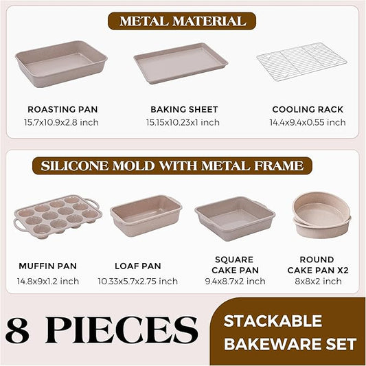 8 Pcs Baking Pans Set, Silicone Bakeware Sets with Metal Reinforced Frame, Nonstick Stackable Carbon Steel Non Toxic Baking Sets for Cooking (Brown)
