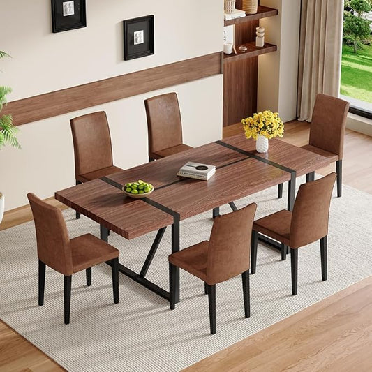 86.6" Dining Table Set for 6, Modern 7 Piece Wood Kitchen Table and Chairs Set, Rectangle Dining Room Table with 6 PU Leather Upholstered Chairs, Ideal for Apartment, Kitchen, Dining Room