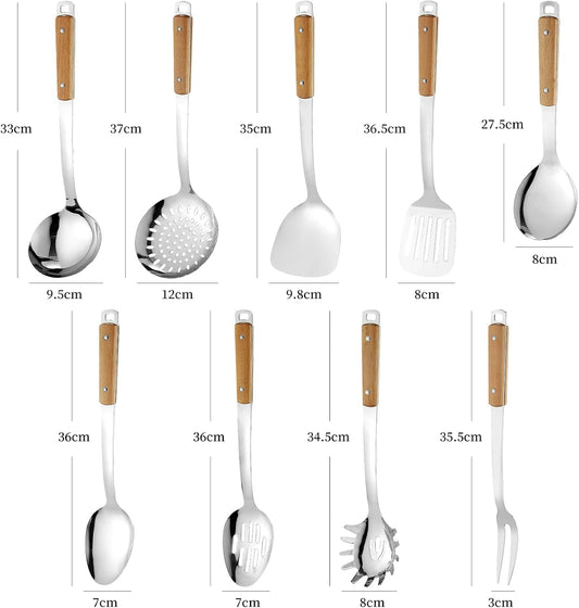 9pcs Cooking Utensils Set 304 Stainless Steel Kitchen Utensils with Wooden Hanlde Metal Kitchen Utensils Soup Ladle Set Dishwasher Safe Kitchen Essentials Set Kitchen Tool Set, Dishwasher Safe