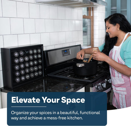 AllSpice Spice Rack Organizer, Wood, 525 Unique Labels, Countertop or Wall Mount, Includes 30 4oz Jars- Matte Black