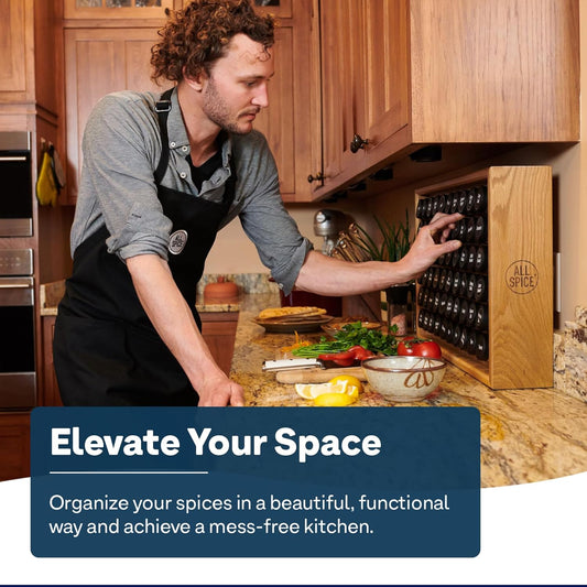 AllSpice Spice Rack Organizer, Wood, 525 Unique Labels, Countertop or Wall Mount, Includes 30 4oz Jars- Cherry Stain