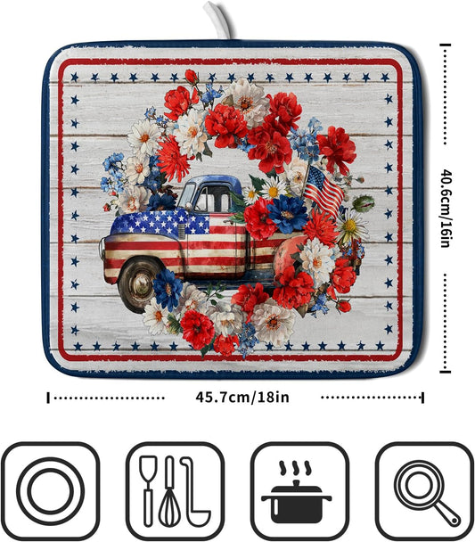 American Flag Dish Drainer Mat Flowers Absorbent Dish Rack Pad for Kitchen Coffee Bar Sinks