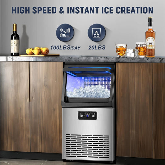 100LBS/24H High Output - Commercial Ice Maker with 20LBS Storage Bin - Dual Water Inlets, 36 Ice Cubes/Cycle, 15" Compact Undercounter/Freestanding Design - Self-Cleaning for Home Bars, Outdoor
