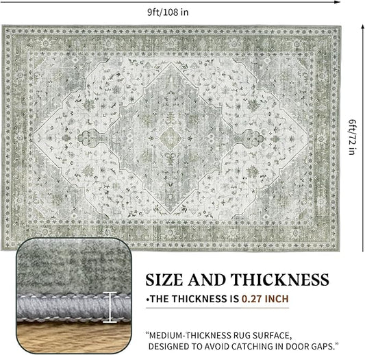 Area Rug for Living Room - Indoor Machine Washable Vintage Rugs for Bedroom Dinning Room Floor Carpet Non-Slip Backing Rugs Floral Soft Low-Pile Office Rug (Sage Green, 6' × 9')
