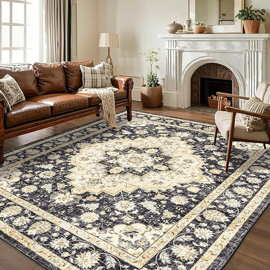 Area Rug for Living Room - Indoor Machine Washable Vintage Rugs for Bedroom Dinning Room Floor Carpet Non-Slip Backing Rugs Floral Soft Low-Pile Office Rug (Black/Beige, 9' × 12')