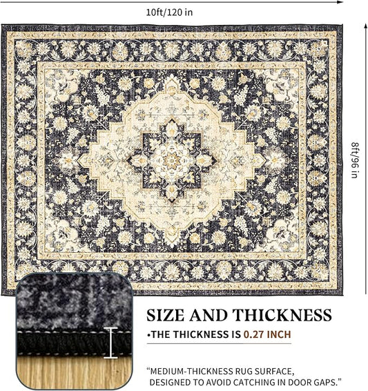 Area Rug for Living Room - Indoor Machine Washable Vintage Rugs for Bedroom Dinning Room Floor Carpet Non-Slip Backing Rugs Floral Soft Low-Pile Office Rug (Black/Beige, 8' × 10')