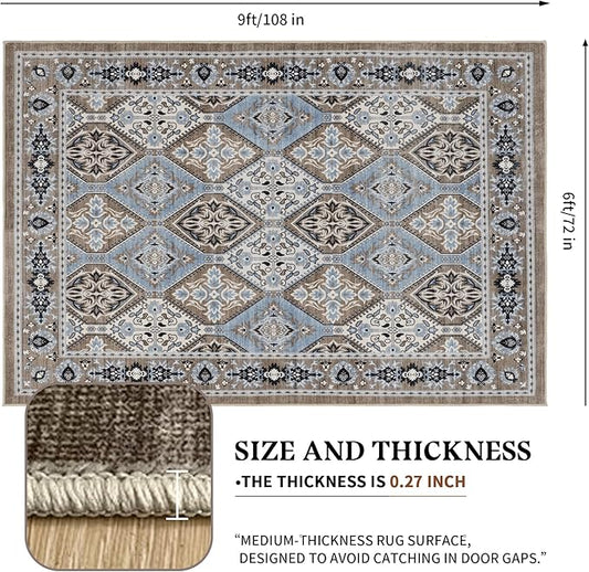 Area Rug for Living Room - Indoor Machine Washable Vintage Rug for Bedroom Dinning Room Floor Carpet Non-Slip Backing Rugs Floral Soft Low-Pile Office Rug (Blue/Brown, 6' × 9')