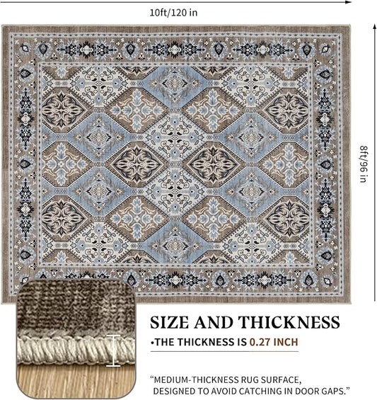 Area Rug for Living Room - Indoor Machine Washable Vintage Rugs for Bedroom Dinning Room Floor Carpet Non-Slip Backing Rugs Floral Soft Low-Pile Office Rug (Blue/Brown, 8' × 10')