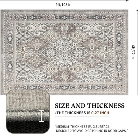 Area Rug for Living Room - 6x9 Vintage Taupe Neutral Washable Rug for Bedroom Dinning Room - Soft Low-Pile Oriental Carpet Non-Slip Tan Rugs for Office - Soft Brown