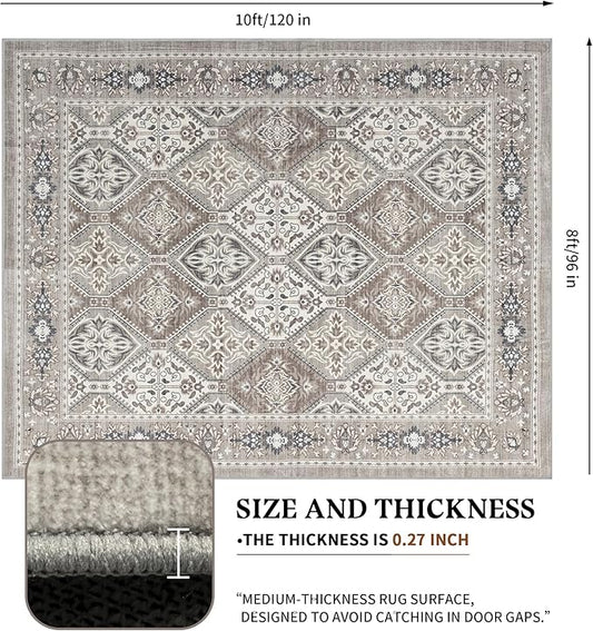 Area Rug for Living Room - 8x10 Boho Vintage Taupe Neutral Washable Rug for Bedroom Dinning Room - Soft Low-Pile Oriental Carpet Non-Slip Tan Rugs for Office - Soft Brown