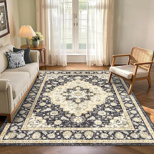 Area Rug for Living Room - Indoor Machine Washable Vintage Rugs for Bedroom Dinning Room Floor Carpet Non-Slip Backing Rugs Floral Soft Low-Pile Office Rug (Black/Beige, 6' × 9')