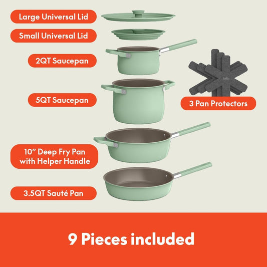 bella 9 Piece Ceramic Nonstick Cookware Set, Fits-anywhere™ Kitchenware w EverGood™ Coating, Dishwasher & Oven Safe, All Stovetops Compatible, Stackable Design, Cool Touch Handles, Seaglass