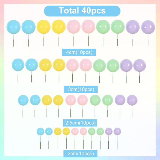 BEISHIDA 40 Pcs Foam Ball Cake Toppers with Sticks Mini Cake Decorations for Birthdays, Weddings, Baby Showers, DIY Baking Supplies, Anniversary Party (Pastel Color)