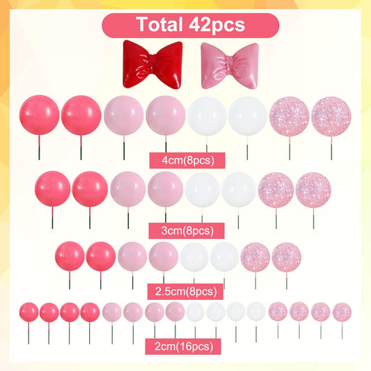 BEISHIDA 42 pcs Foam Ball Cake Toppers with Sticks Includes 2 Bow Cake Decor Perfect for Birthday Party Pink&White Theme Party Decor Wedding Anniversary Celebration(Pink, White)