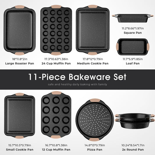 11-Piece Nonstick Baking Pan Set, Stackable Bakeware Sets, Oven Pans for Baking with Silicone Handles, Includes Cookie Sheet, Cake Pans, Loaf Pan, Pizza Pan, Muffin Pan, Black
