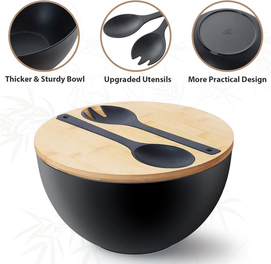 11.3" Extra Large Salad Bowl with Wooden Lid & Servers, 208Oz, Oversized Bamboo Fiber Salad Serving Set with Utensils for Home/Kitchen, Big Lightweight Bowl for Mixing Salad,Fruit,Pasta - Matte Black