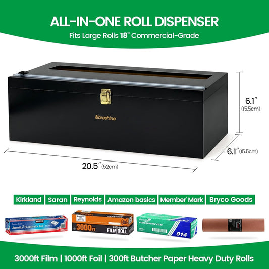 Black 18 Inch Commercial Plastic Wrap Dispenser with Cutter & Roller - Heavy Duty 3000ft Film & 1000ft Foil Holder - Fits Butcher, Freezer, Kraft Paper for Restaurant Kitchen Food Service