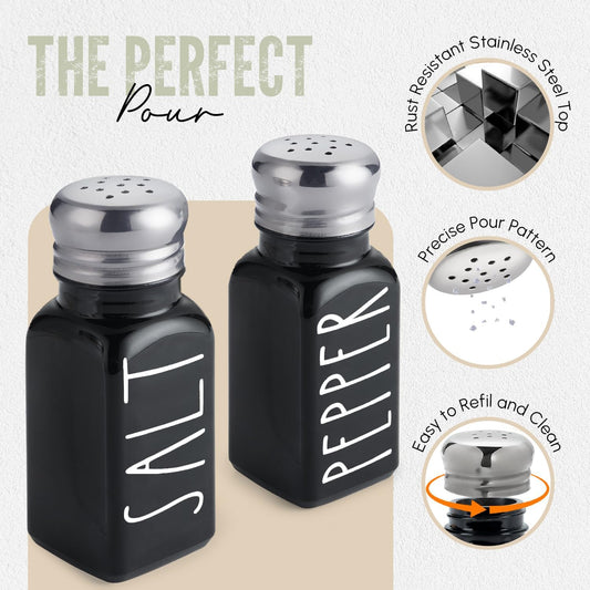 Black Salt and Pepper Shakers Set by Brighter Barns - Cute Kitchen Decor - Gothic or Halloween Kitchen Decor - Glass Shaker with Stainless Steel Lid for Home, Restaurant, Gifts (Black)