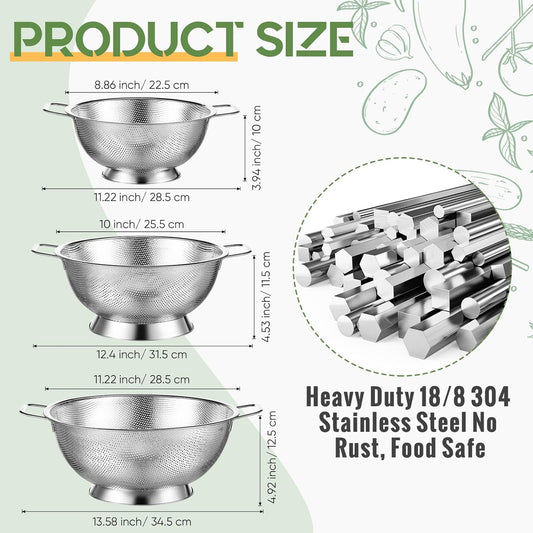 Bokon 3 Pcs Stainless Steel Colander Set Colander Bowl and Sieves 1/3/5 Quart Metal Mesh Strainer Net Basket with Handles Food Spaghetti Strainer for Kitchen Draining Pasta Rinsing(Silver)