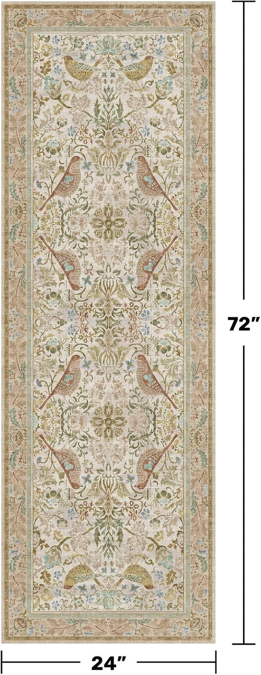 Boho Long Bathroom Runner Rug 2x6 - Floral & Bird Runner Rug for Kitchen Floor, Hallway, Laundry Room, Bedroom, Entrance, Beige Neutral Vintage Decor, Washable Non Slip Low Pile