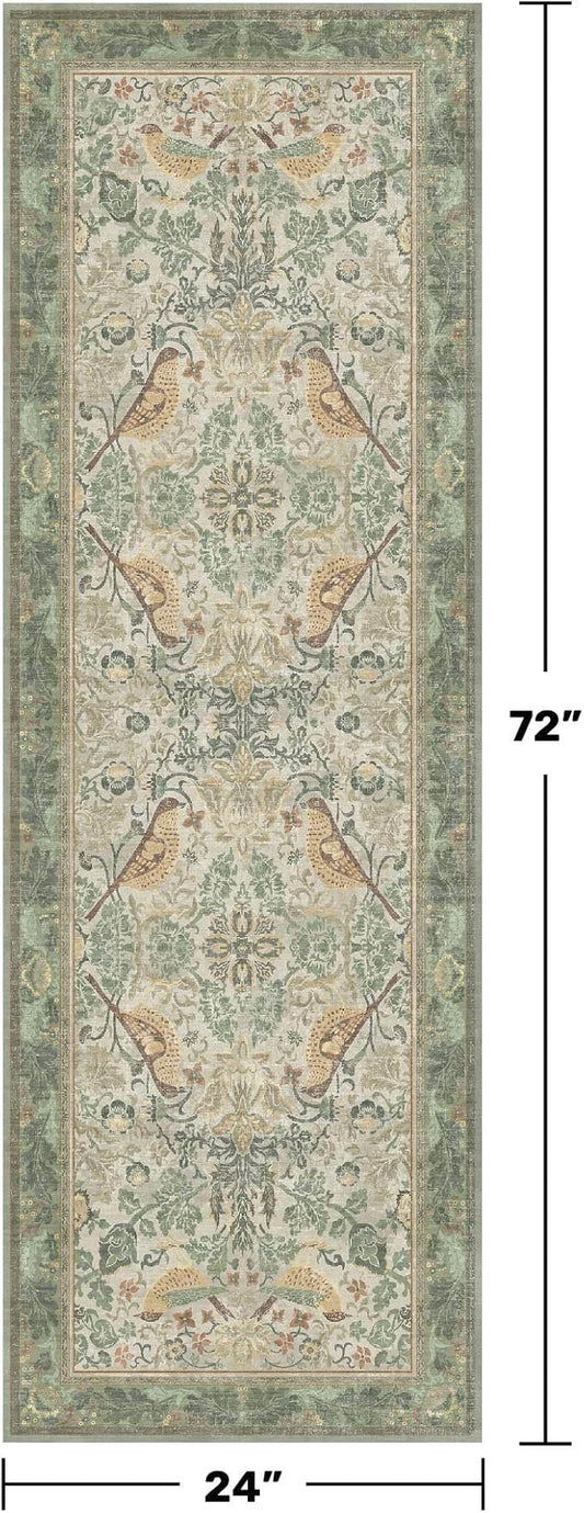 Boho Long Bathroom Runner Rug 2x6 - Floral & Bird Runner Rug for Kitchen Floor, Hallway, Laundry Room, Bedroom, Entrance, Sage Green Vintage Decor, Washable Non Slip Low Pile - Light Green