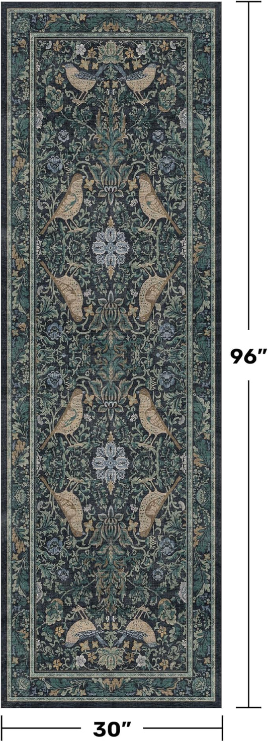 Boho Vintage 2'6"x8' 8ft Hallyway Long Runner Rug - Non Slip Washable Front Door Rug Indoor Entrance, Kitchen, Bathroom, Low Pile & Soft Woodland Floral Kitchen Floor Mats