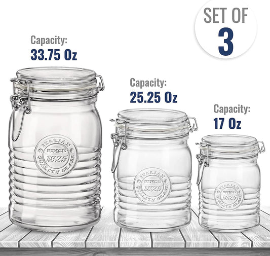 Bormioli Rocco Officina 1825, Set of 3 - Clear Glass Jars with Swing Top - Vintage Industrial Style Airtight Containers for Dry Food Storage, 33.75 Oz, 25.25 Oz, 17 Oz - Dishwasher Safe, Made in Italy
