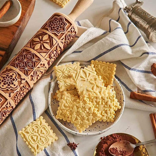 Christmas Wooden Rolling Pin for Baking,Engraved Embossing Rolling Pin Cookie Stamps Roller Square Grid Cookies Mold Kitchen Decor Tools for Kids Adults(Flower Window)
