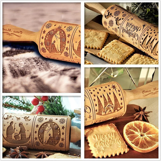 Christmas Wooden Rolling Pin for Baking,Engraved Embossing Rolling Pin Cookie Stamps Roller Square Grid Cookies Mold Kitchen Decor Tools for Kids Adults(Jesus Nine Palaces)