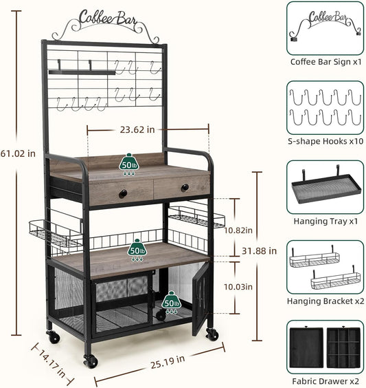 Coffee Bar Cabinet with Storage, Coffee Cart with Wheels, Coffee Station with Coffee Bar Sign and Mug Hook, Corner Coffee Bar Table with Drawer, Bakers Rack for Kitchen Dining Room Living Room Nook