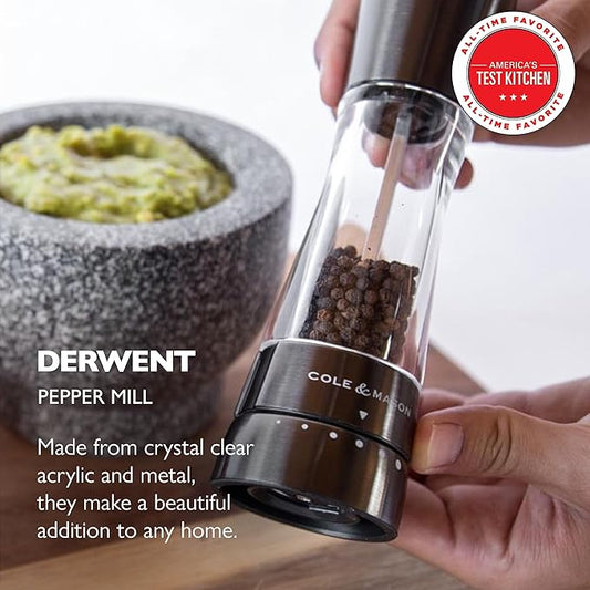 Cole & Mason Derwent Pepper Mill - Refillable Pepper Grinder with Gourmet Precision Mechanisms - Kitchen Accessories for Cooking - Black Peppercorn Grinder for Seasoning - Pepper Mill, Stainless Steel